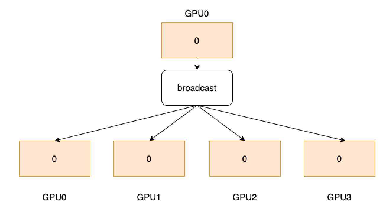 如下图所示,4 个 GPU 分别开启 1 个进程,rank=0 的进程拥有数据 0。 广播操作后,数据 0 会被发送到所有进程上。