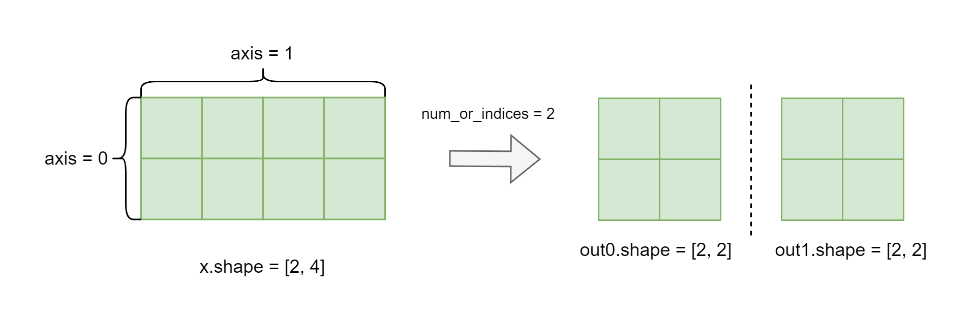 num_or_indices是一个整数n,则x拆分为n部分。如果num_or_indices是整数索引的列表或元组,则在每个索引处分割x。name (str,可选) - 具体用法请参见 Name,一般无需设置,默认值为 None。