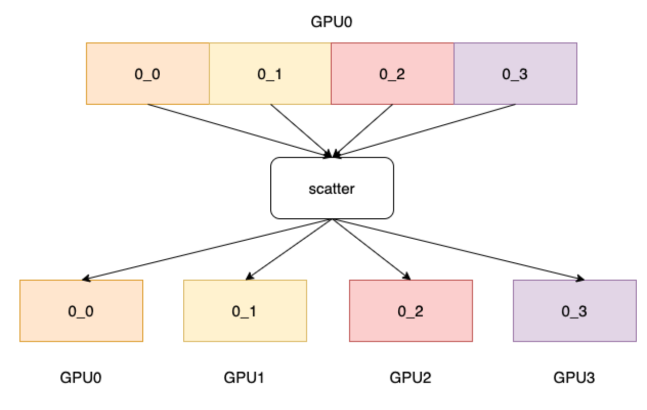 如下图所示,4 个 GPU 分别开启 1 个进程,将分发 rank=0 的进程拥有的数据。 分发操作后,rank=0 的进程拥有的数据被平均分配到每个进程上。