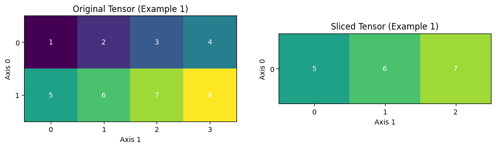 下图展示了示例 1 中的情形——一个形状为[2, 4]的二维张量通过切片操作转变为形状为[1, 3]的二维张量。切片操作指定了在第 0 轴和第 1 轴上的起始和结束索引,可以清晰地看到切片操作前后张量中各元素的对应关系。