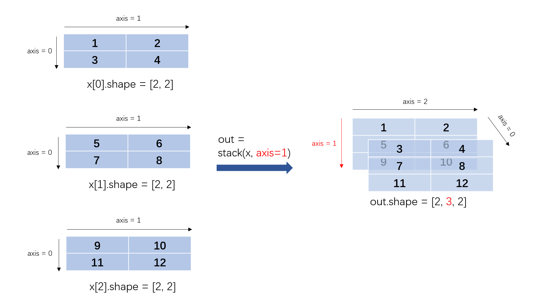 input。axis (int,可选) – 指定对输入 Tensor 进行堆叠运算的轴,有效 axis 的范围是:[−(R+1),R+1),R 是输入中第一个 Tensor 的维数。如果 axis < 0,则 axis=axis+R+1。默认值为 0。别名