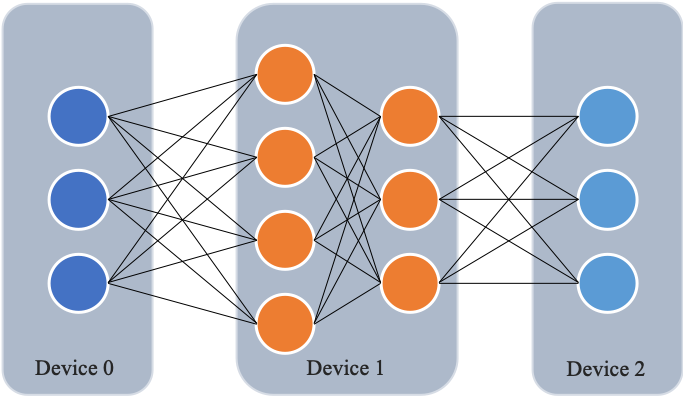 使用流水线并行,可以实现超大规模模型训练。例如,使用多个计算设备,可以实现单个计算设备显存无法容纳的模型训练。