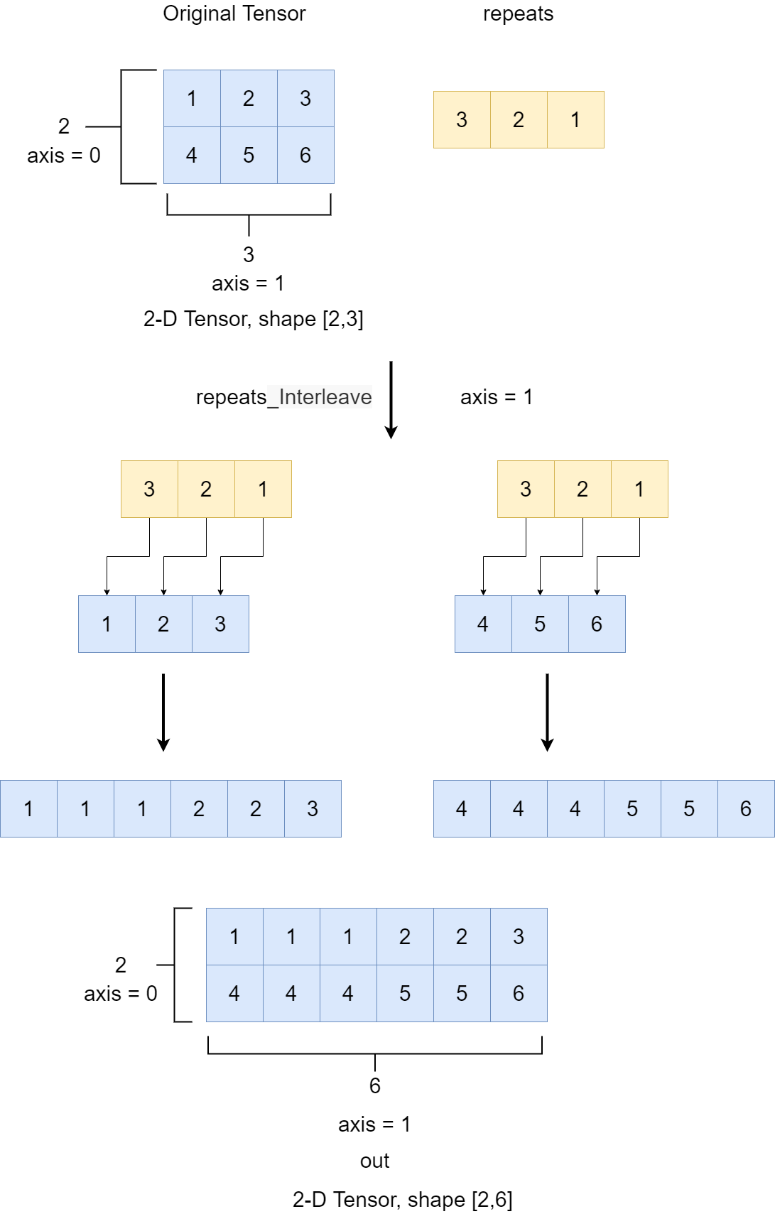 示例一图解说明: 以下图为例,输入张量 [[1, 2, 3], [4, 5, 6]],重复次数 repeats 为 [3, 2, 1],参数 axis =1,表示第 1 列元素重复 3 次,第 2 列重复 2 次,第 3 列重复 1 次。