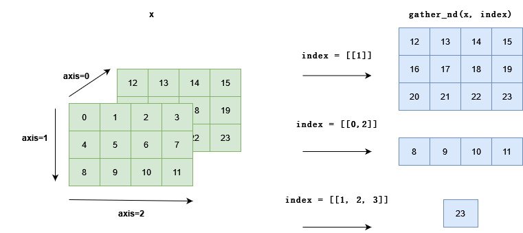 显然,index.shape[-1] <= x.rank 并且输出 Tensor 的维度是 index.shape[:-1] + x.shape[index.shape[-1]:] 。