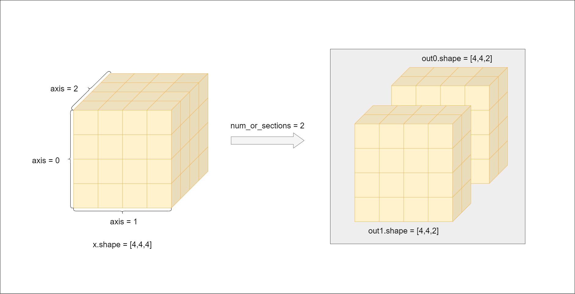 下图展示了一个 split 的情形——一个形状为[4,4,4]的三维张量在进行 split 操作, 其中参数 num_or_sections 为 2, axis 为 2。通过比较,可以清晰地看到张量在切割前后的变化。