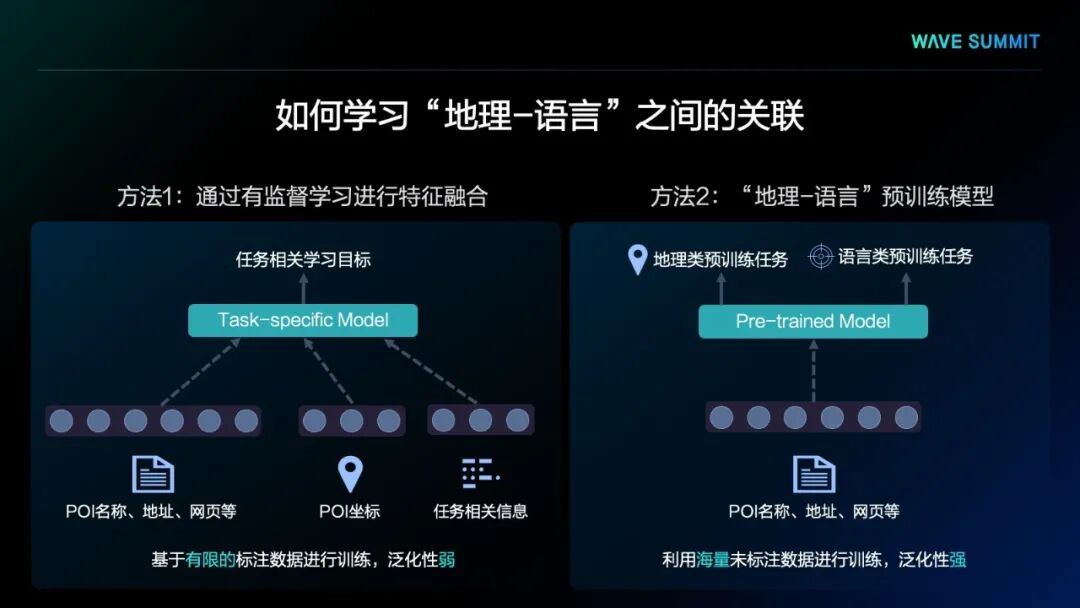 实现语义与空间的双轮驱动,其中一种可行的方案是学习并建模『地理-语言』之间的关联。第一类方法是通过有监督学习的方式,对地理信息和文本信息进行特征融合,并在特定任务中学习这两类特征之间的关系。由于这类方法往往基于有限的标注数据进行训练,所以泛化性较弱。第二类方法是通过预训练的方式,在训练过程中通过预训练任务的设计直接学习『地理-语言』之间的关联。这类方法可以利用海量未标注数据进行训练,泛化性较强。