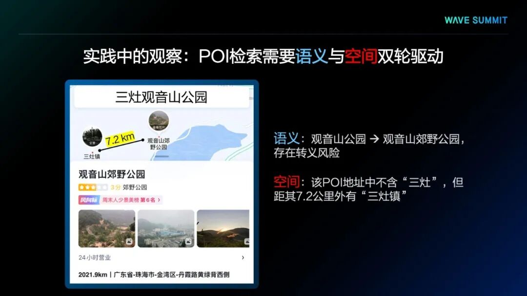 首先介绍一下我们在实践中的一个发现,就是做好POI检索系统,需要语义与空间双轮驱动。我们以一个真实的示例为例进行说明。用户输入的查询是『三灶观音山公园』,我们返回给用户的唯一结果是位于广东珠海的『观音山郊野公园』。从文本匹配上看,这个POI的名称是“观音山郊野公园”,与用户输入的查询“观音山公园”,不仅在语义上存在一定的转义风险,而且我们还能发现这个POI地址并不含有“三灶”。如果加上空间相关性,就会发现距其7.2公里外有“三灶镇”,从语义与空间联合匹配的角度上,我们才能最终推断出用户想找的是位于广东珠海的这个名为『观音山郊野公园』的POI。