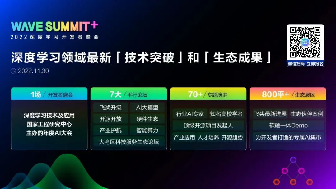 WAVE SUMMIT+2022将于11月30日举办,欢迎大家扫码报名!关注飞桨公众号,后台回复关键词「WAVE」进入官网社群了解更多峰会详情!