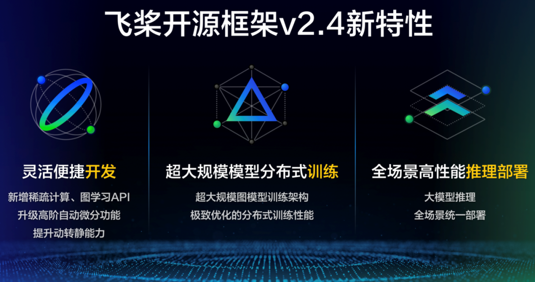此次飞桨升级的2.4版本,框架开发更加灵活便捷,大规模模型分布式训练持续领先,并实现了全场景高性能推理部署。